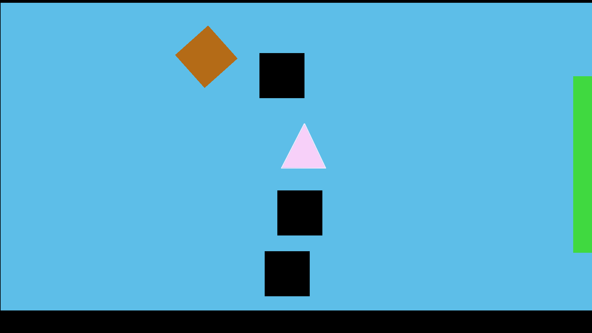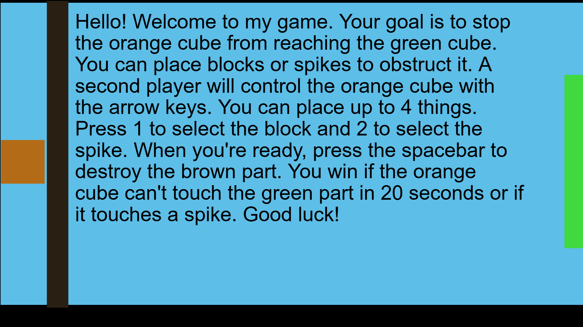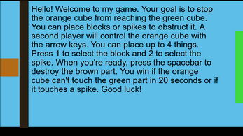 Hello! Welcome to my game. Your goal is to stop the orange cube from reaching the green cube. You can place blocks or spikes to obstruct it. A second player will control the orange cube with the arrow keys. You can place up to 4 things. Press 1 to select the block and 2 to select the spike. When you're ready, press the spacebar to destroy the brown part. You win if the orange cube can't touch the green part in 20 seconds or if it touches a spike. Good luck!